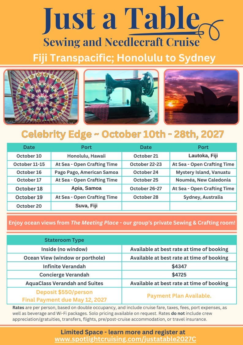 Cruise from Honolulu to Sydney, Australia.  With eleven days at sea plus six port days – there will be plenty of time to quilt and explore islands in the Pacific.  The featured project will be the 2027 Quiltworx Technique of the Month pattern (to be released January 2027)